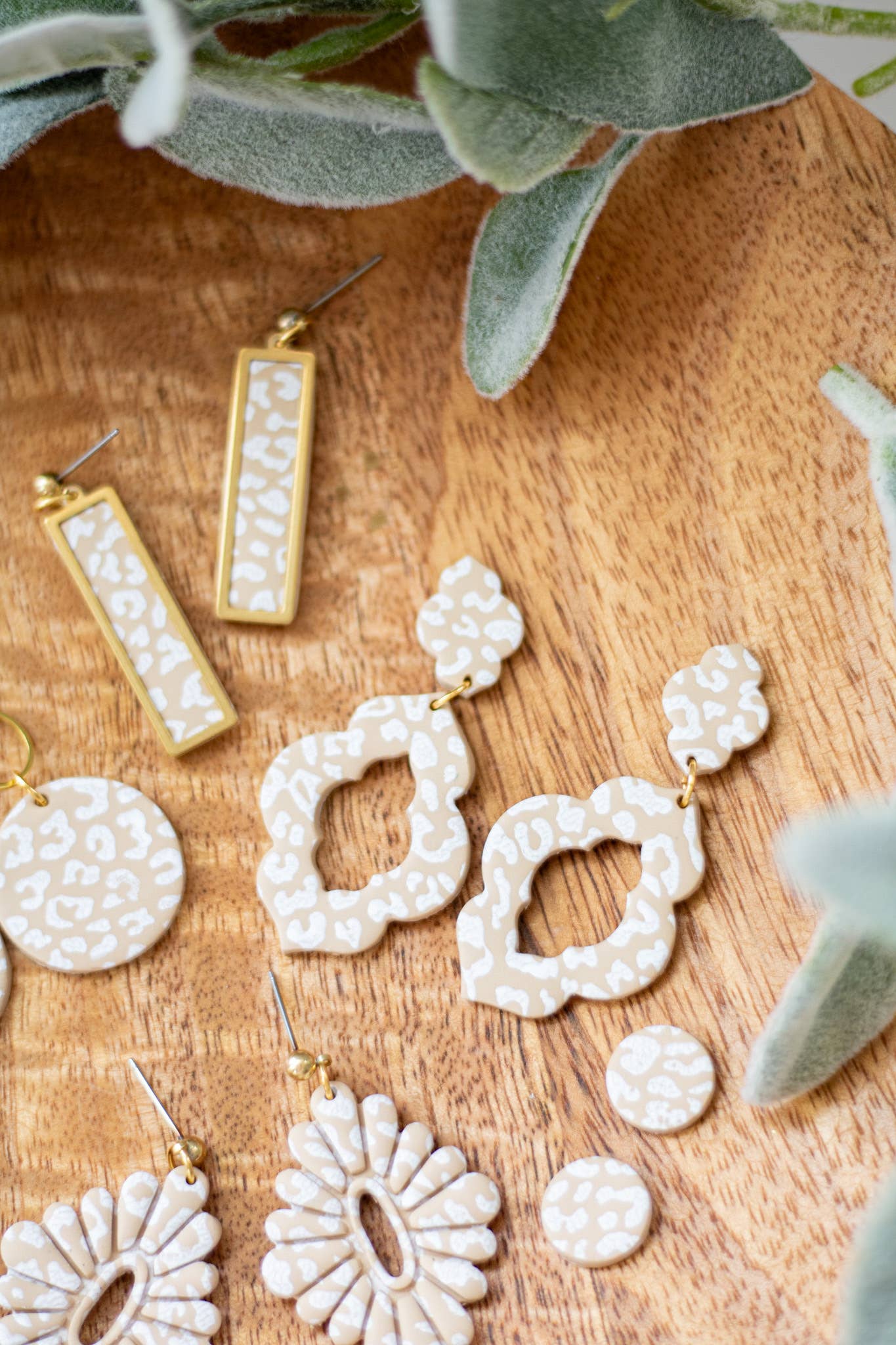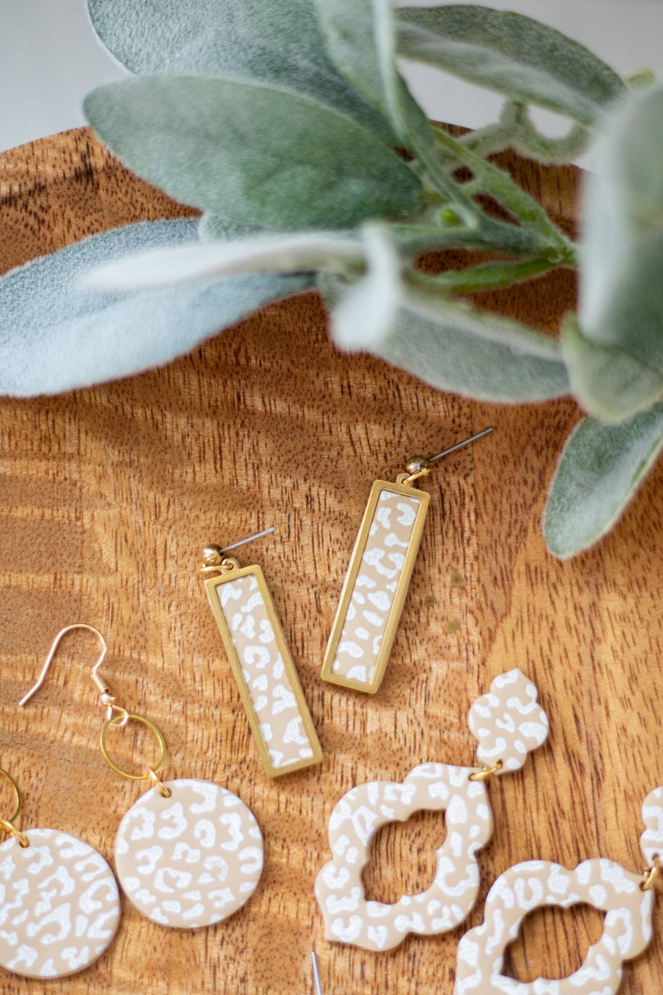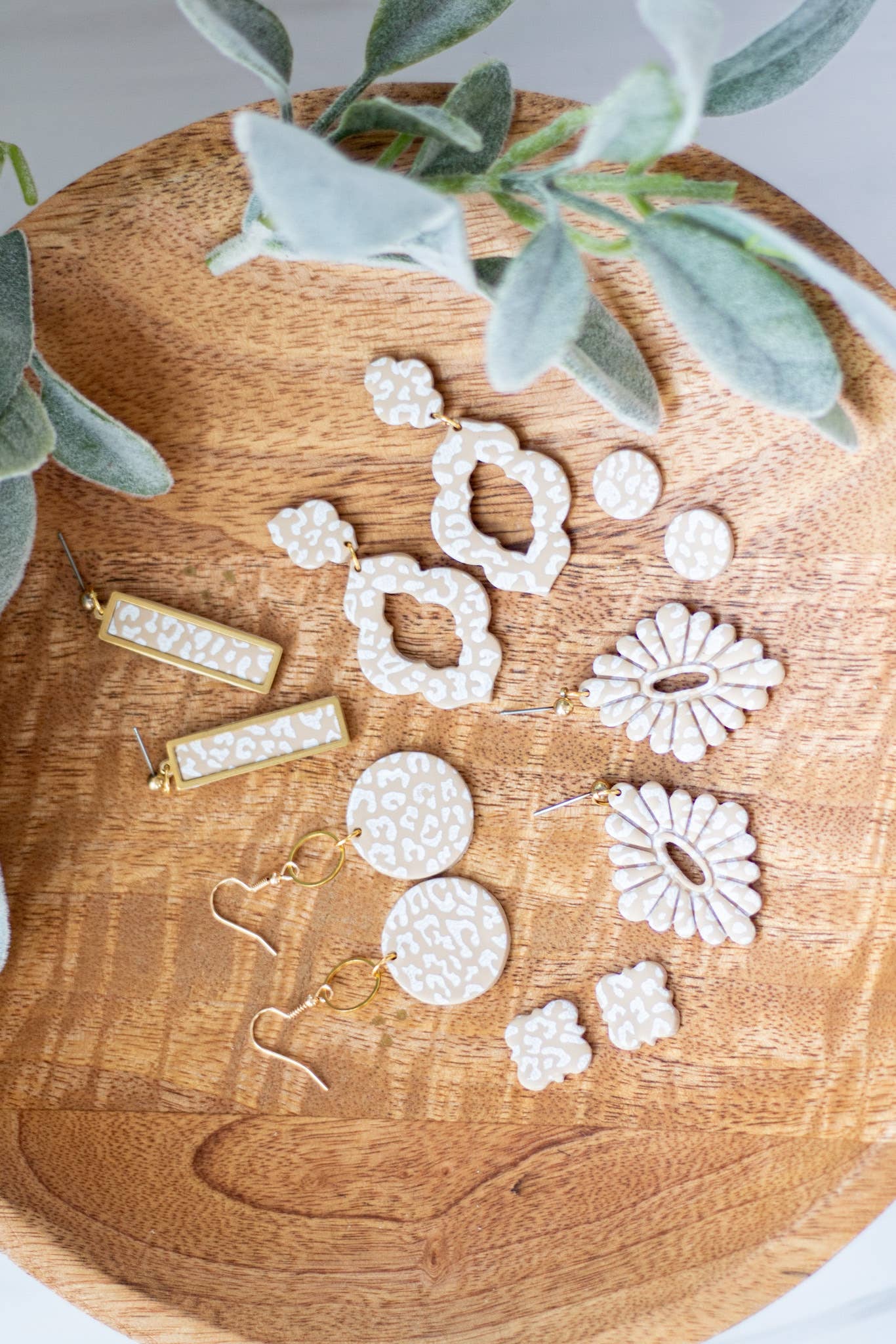 Experience the elegance of the Champagne Leopard Collection from EJ Clay Co. This dazzling jewelry set, characterized by its dangle hoop earrings, is designed to bring out your wild side in the most sophisticated way. Crafted by a passionate team in Knoxville, TN, these lightweight pieces are perfect for sensitive ears. Embrace the handmade quality and support a thriving small business with your purchase. Enjoy the charm of these unique accessories that are packed with care to ensure safe delivery.