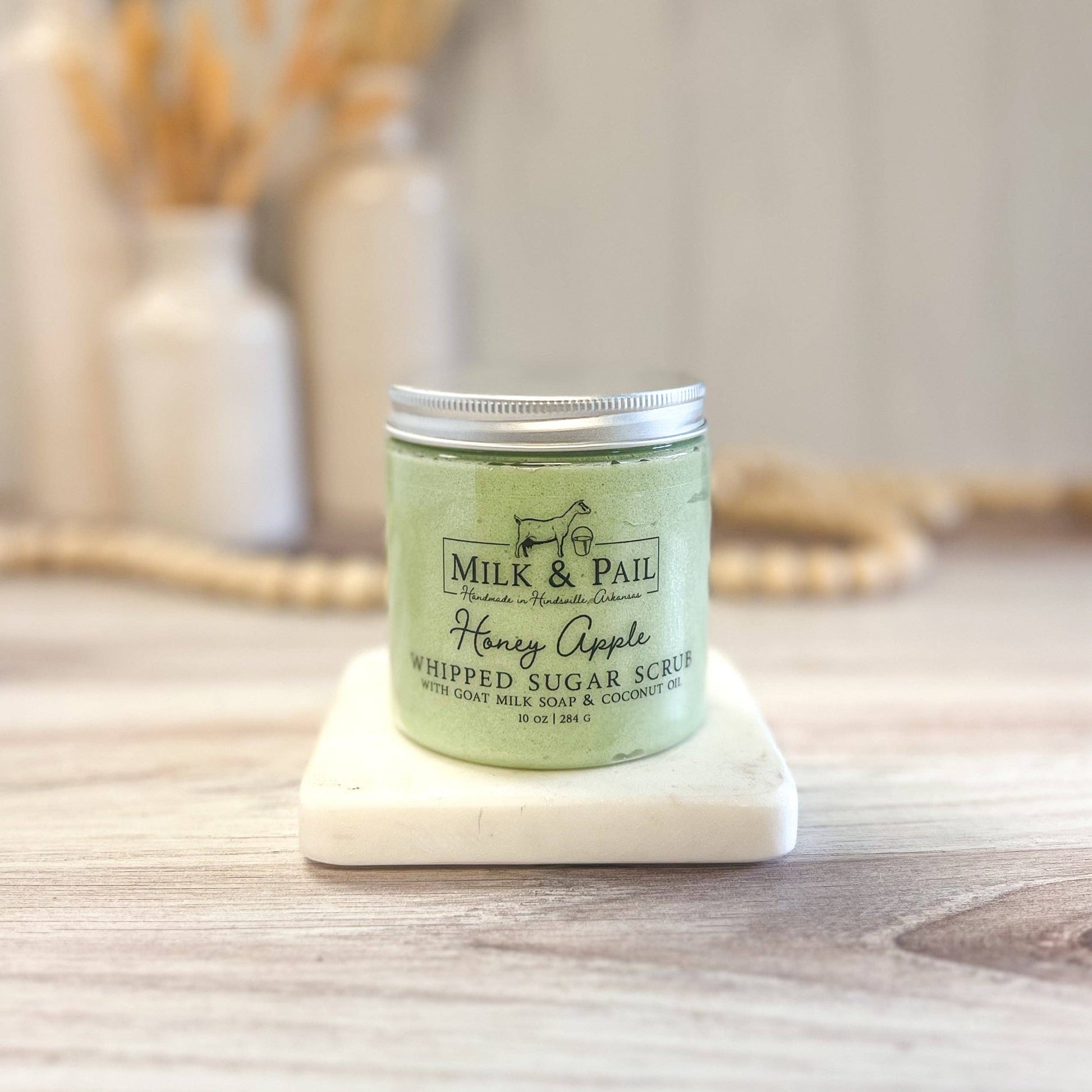 Our whipped sugar scrub combines goat milk soap, coconut oil and sugar to create a creamy body scrub to exfoliate, cleanse and moisturize your skin in one unique blend. Scented with phthalate free fragrance oils.
