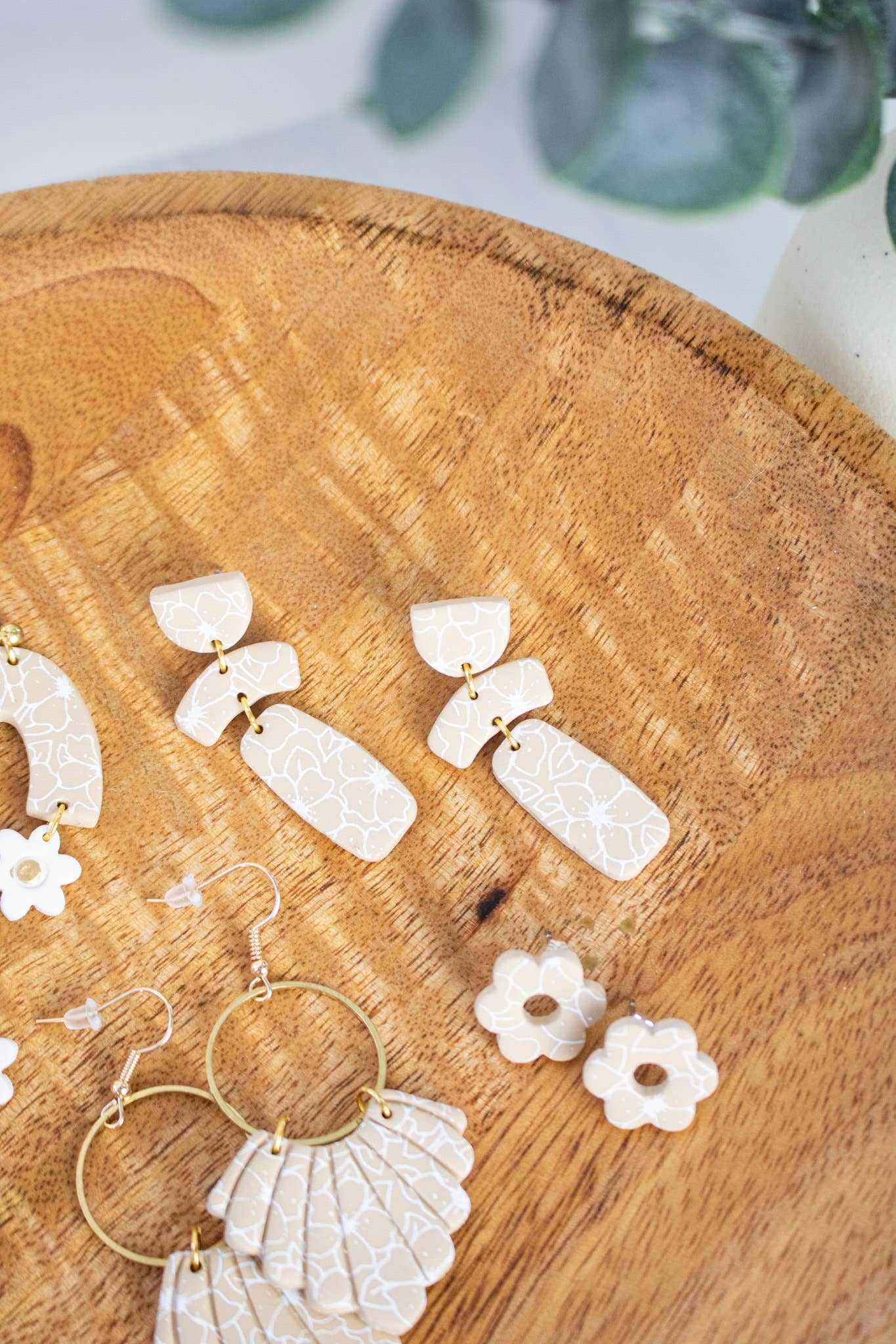 Discover the elegant allure of EJ Clay Co's Neutral Flower Collection. This jewelry set, featuring an exquisite range of dangle hoop earrings, is a testament to our dedication to quality and design. Each piece is handmade by our passionate team in Knoxville, TN, ensuring a unique touch in every item. Lightweight and made with nickel and lead-free studs, our earrings are perfect for sensitive ears. Enjoy the comfort and style of our creations, carefully packed in boxes with air bubbles for safe delivery. Experience the charm of our Neutral Flower Collection, lovingly made for you.