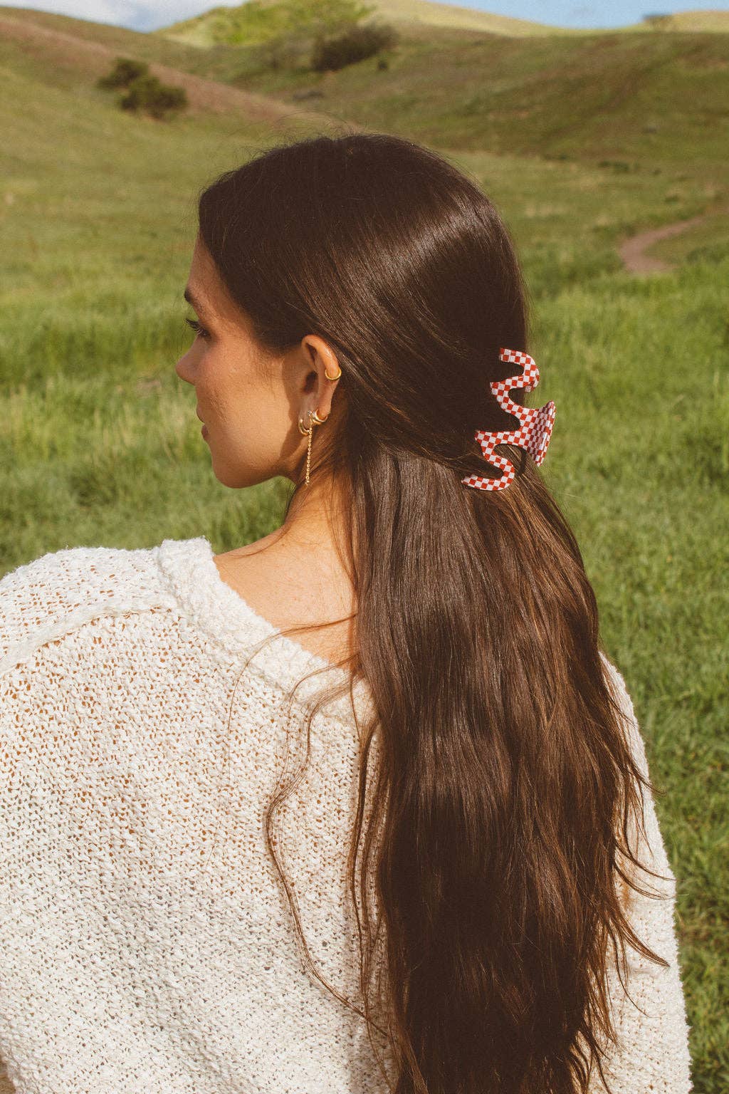 This medium wavy style claw clip is so perfect and festive for the 4th of July! It's the perfect red and white checkered pattern. The best way to elevate your updo for the day. This is a medium 3.5 inch claw clip.