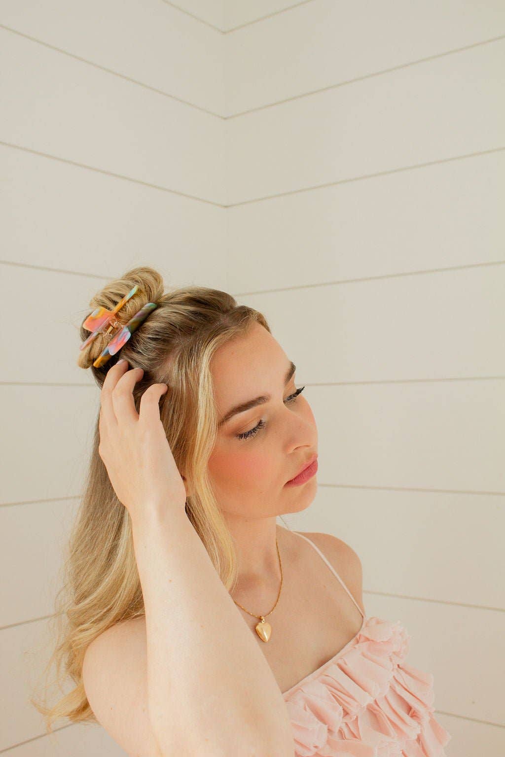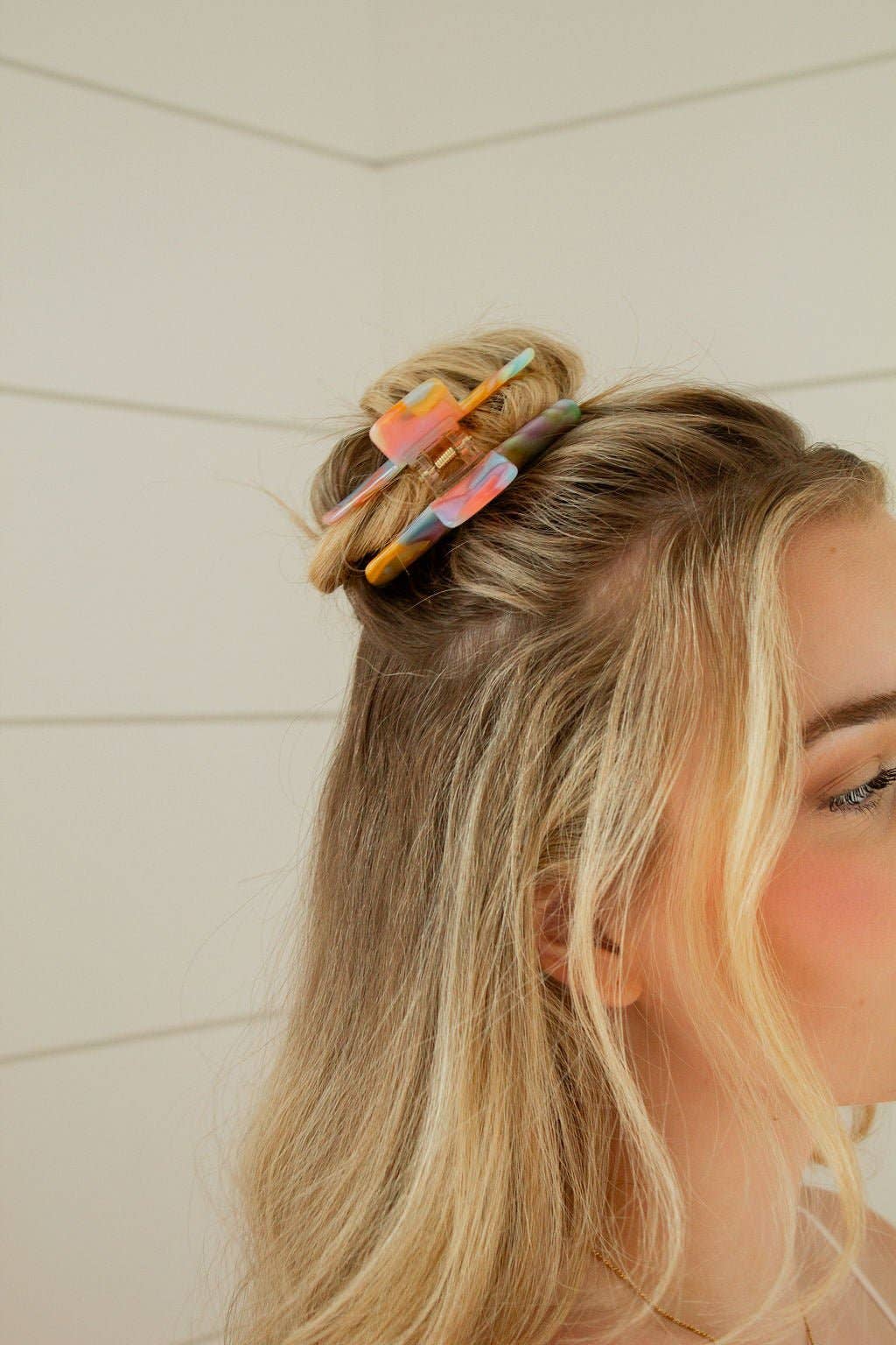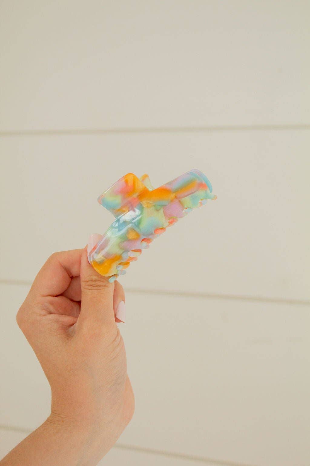 Our clips put a beautiful Andi touch on the hair clips you thought you knew. This claw clip is the cutest rainbow marble and is made of high-quality acetate. Pair this with any outfit for a fun and colorful pop! It is a medium, 3.25 inch claw clip.